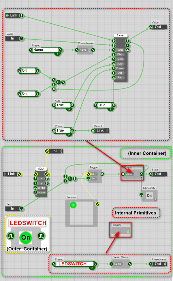 When you save a knob into your toolbox, or re-use a knob from another module in a previous synth, the previous preset parameters for that knob are still saved in the preset parameter prim’s code. The Preset manager prim stores a list of preset names alongside a corresponding index value. When you change a preset the manager just sends out the index number to all the prims with an active P connector. So it says “Hey guys, you all need to pick preset number 17 now”. AFAIK the preset parameter module in the knob doesn’t need to tell the Manager that the value stored for that preset number has changed, until the Manager is asked to save a preset, at which point he needs the information to put in the text file. Likewise when you load a preset or bank the Manager distributes the new parameter values based on the parameter names in the text file.